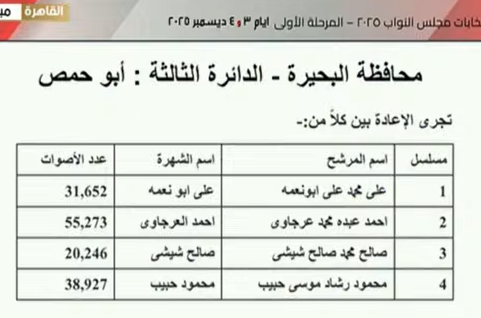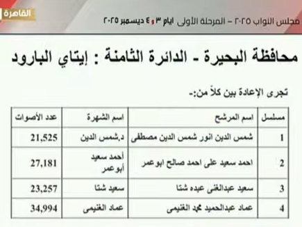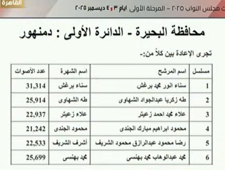 أعلن القاضي حازم بدوي رئيس الهيئة الوطنية للانتخابات، نتيجة انتخابات النواب 2025 للمرشحين بالنظام الفردي في محافظتي البحيرة، ودائرة الرمل في الإسكندرية.