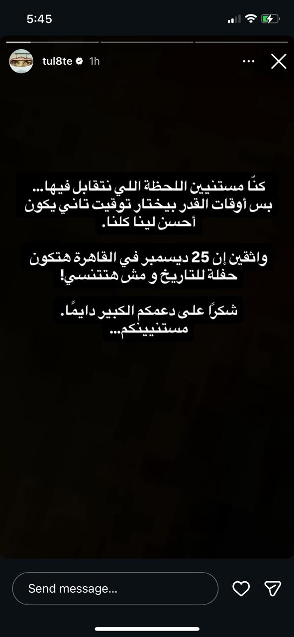 وكشف تووليت اليوم عبر حسابه بخاصية تبادل الصور والفيديوهات انستجرام عن الموعد النهائي للحفل حيث قال: كنا مستنيين اللحظة اللي نتقابل فيها، بس أوقات القدر بيختار توقيت تاني يكون أحسن لينا كلنا، واثقين إن 25 ديسمبر في القاهرة هتكون حفلة للتاريخ ومش هتتنسي، شكرًا على دعمكم الكبير دايما مستنيينكم.