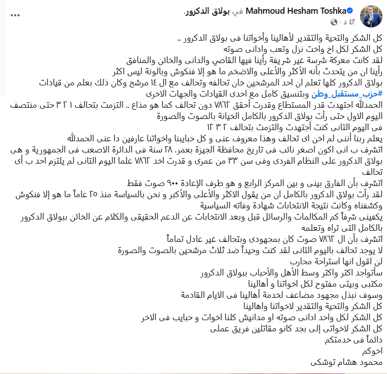 أضاف توشكى خلال منشور له عبر فيسبوك: كل الشكر والتحية والتقدير لأهالينا وأخواتنا في بولاق الدكرور، كل الشكر لكل أخ وأخت نزل وتعب وادانى صوته، لقد كانت معركة شرسة غير شريفة رأينا فيها القاصي والداني والخائن والمنافق، رأينا ان من يتحدث بأنه الأكثر والأعلى والأضخم ما هو إلا فنكوش وبالونة ليس أكثر، بولاق الدكرور كلها تعلم أن أحد المرشحين خان تحالفه وتحالف مع الـ 14 مرشحا وكان ذلك بعلم من قيادات حزب مستقبل وطن وبتنسيق كامل مع إحدى القيادات والجهات الأخرى.