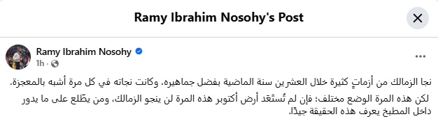 كتب رامي نصوحي عضو مجلس إدارة نادي الزمالك عبر حسابه الشخصي على فيسبوك تعليقًا على آخر تطورات أزمة سحب أرض مدينة السادس من أكتوبر.