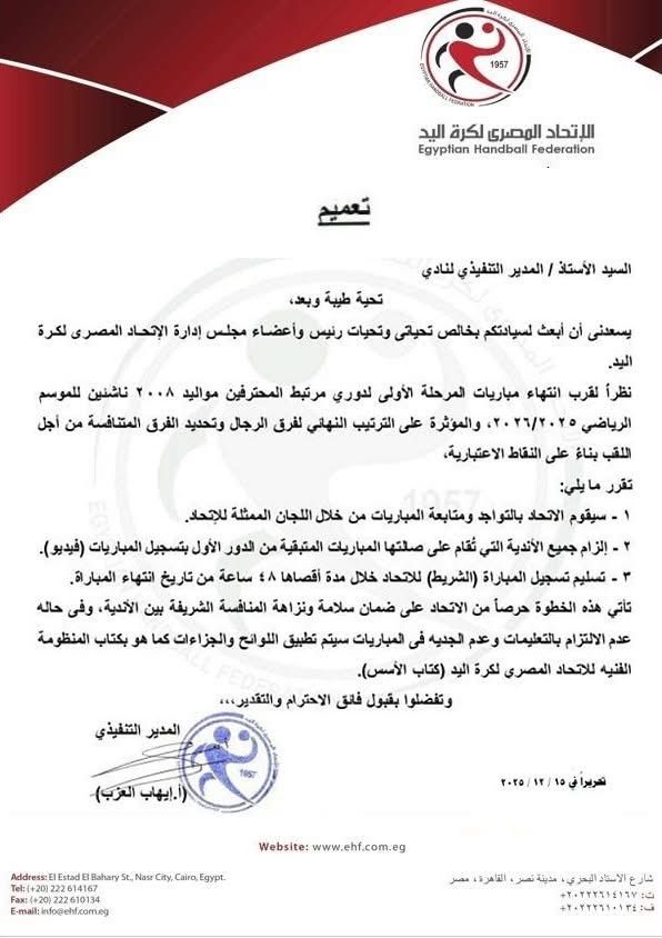 وأكد اتحاد اليد، أن هذه الخطوة تأتي حرصًا على ضمان السلامة ونزاهة المنافسة الشريفة بين الأندية، مشددًا على أنه في حال عدم الالتزام بالتعليمات أو عدم الجدية في التنفيذ، سيتم تطبيق اللوائح والجزاءات المنصوص عليها في لائحة الاتحاد المصري لكرة اليد (كتاب الأسس).