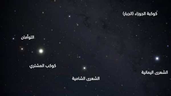 ووفقًا للجمعية الفلكية بجدة، يتصدر المشهد نجم الشعرى اليمانية، ألمع نجم في السماء ليلًا، الواقع ضمن كوكبة الكلب الأكبر، ويتميز بلونه الأبيض المائل إلى الزرقة وسطوعه الشديد، ما يجعله علامة بارزة في سماء الشتاء. وبالقرب منه تظهر الشعرى الشامية في كوكبة الكلب الأصغر، لتشكّل مع نجم منكب الجوزاء ما يُعرف بـ مثلث الشتاء الشهير.