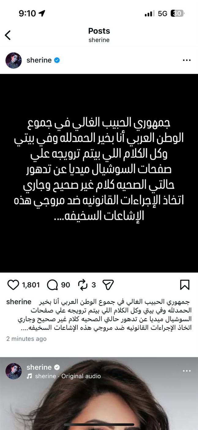 ونشرت شيرين عبدالوهاب عبر حسابها الرسمي قائلة: جمهوري الحبيب الغالي في جموع الوطن العربي أنا بخير الحمدلله وفي بيتي وكل الكلام اللي بيتم ترويجه على صفحات السوشيال ميديا عن تدهور حالتي الصحية كلام غير صحيح وجار اتخاذ الإجراءات القانونية ضد مروجي هذه الشائعات السخيفة.