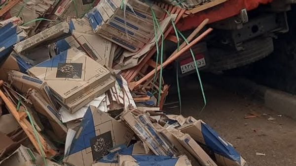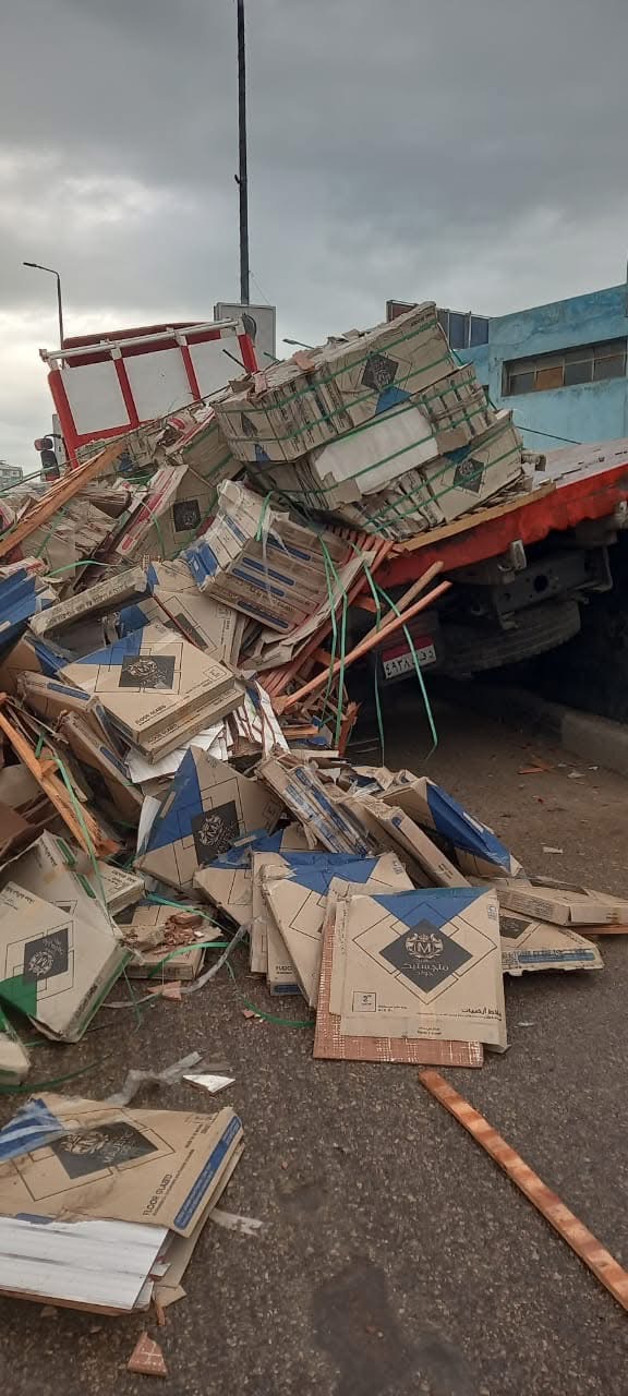 رفع آثار انقلاب سيارة نقل محمّلة بالسيراميك أعلى كوبري سندوب بالمنصورة
