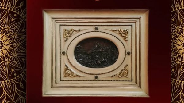 واللوحة مصنوعة من الخشب المدهون باللون البيج على عدة مستويات، ويبرز في مركزها شكل بيضاوي من البرونز المطروق يصور الجنود يمتطون الخيول، مع ظهور القساوسة والرهبان، بينما ترفع رايات أمام أحد الكنائس، في مشهد يحاكي الفن الأوروبي الكلاسيكي.