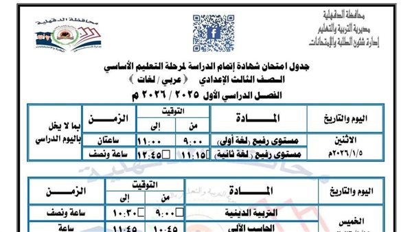 - تنعقد امتحانات الصف الثالث الإعدادي (عام ومهني) من 15 حتى 22 يناير 2026.