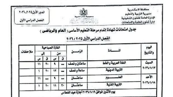 جدول امتحانات الصف الثالث الإعدادي 2026 محافظة الإسكندرية