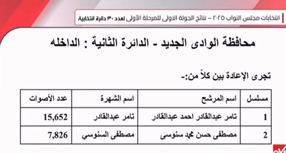 أعلن القاضي حازم بدوي، رئيس الهيئة الوطنية للانتخابات، النتيجة الرسمية لانتخابات الـ30 دائرة الملغاة بأحكام قضائية من المرحلة الأولى لانتخابات مجلس النواب 2025، التي أجريت فيها التصويت يومي 10 و11 ديسمبر بالداخل، وذلك في محافظات أسيوط والوادى الجديد وسوهاج.