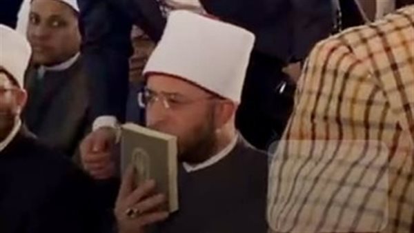 تجاوز أحد المواطنين صفوف المصلين في لحظة عفوية، ليصل إلى الصف الأول، مقدمًا مصحفًا شريفًا كهدية للدكتور أسامة الأزهري، وزير الأوقاف.