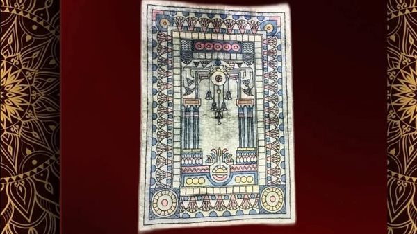 وتزين السجادة زخارف غنية تضم أشكالًا لوزية ودوائر وزهور اللوتس، بينما تتوسط ساحة السجادة مناظر معمارية تحاكي شكل المعابد المصرية القديمة، وقد نُفذت هذه العناصر الفنية بدقة لافتة باستخدام ألوان الأزرق والبرتقالي والأسود، في تناغم بصري يعكس الذوق الفني الرفيع.