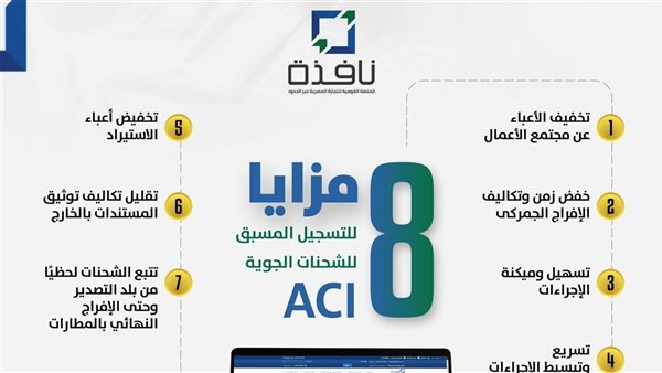 يبدأ في الأول من يناير المقبل تطبيق تطبيق نظام ACI على الشحنات الجوية، وذلك في ضوء سعي مصلحة الجمارك لتقليل زمن الإفراج الجمركي عن البضائع للتيسير على شركائنا بما يحقق مستويات أعلى من الشفافية والدقة، وفي ظل هذا النظام سيكون دور المستخلص الجمركي قائمًا ضمن المنظومة، ولكنه سيتم بشكل إلكتروني كامل، بما يعزز من سرعة ودقة الإجراءات.