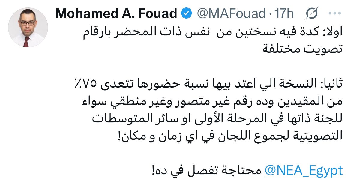 وقال فؤاد، في منشور على صفحته الرسمية بموقع إكس، إن الواقعة تتضمن تضاربًا واضحًا في المحاضر، حيث توجد نسختان من المحضر ذاته بأرقام تصويت مختلفة، بما يخل بمبدأ سلامة التوثيق واليقين الإجرائي.