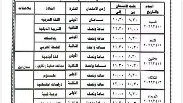 - الأربعاء 14 يناير 2026: امتحان مادة الدراسات الاجتماعية.