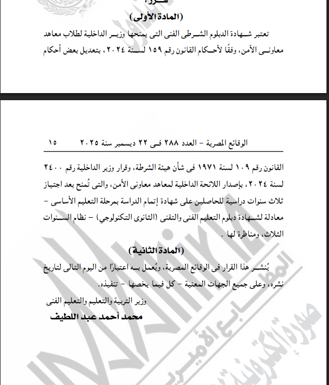 ونصت المادة الأولى، من العدد سالف الذكر، بأن تعتبر شهادة الدبلوم الشرطى الفنى التي يمنحها وزير الداخلية لطلاب معاهد معاوني الأمن، وفقًا لأحكام القانون رقم 159 لسنة 2024، بتعديل بعض أحكام القانون رقم 109 لسنة 1971 في شأن هيئة الشرطة، وقرار وزير الداخلية رقم 2400 لسنة 2024، بإصدار اللائحة الداخلية لمعاهد معاونى الأمن، والتي تمنح بعد اجتياز ثلاث سنوات دراسية للحاصلين على شهادة إتمام الدراسة بمرحلة التعليم الأساسي معادلة الشهادة دبلوم التعليم الفنى والتقنى الثانوى التكنولوجي) - نظام السنوات الثلاث، ومناظرة لها.