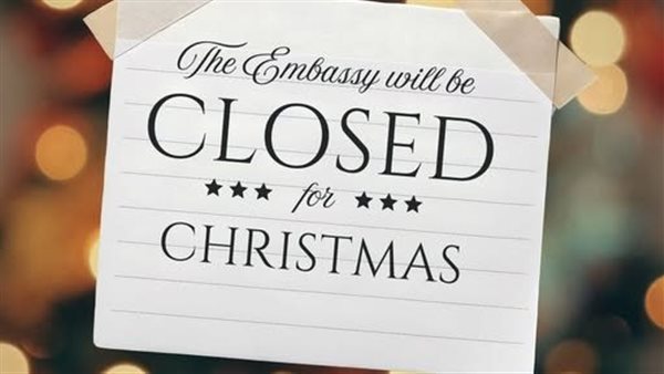 وقالت السفارة في بيان: بمناسبة عيد الميلاد المجيد، ستُغلق سفارة الولايات المتحدة الأمريكية في القاهرة من يوم الثلاثاء الموافق 23 ديسمبر وستستأنف العمل يوم الأحد الموافق 28 ديسمبر، كما سيُغلق المركز الأمريكي الموجود بالسفارة.