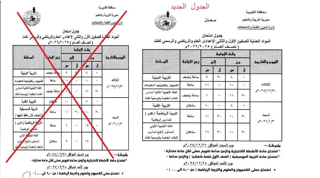 أعلنت مديرية التربية والتعليم بمحافظة القليوبية، تعديل جدول امتحانات الفصل الدراسي الأول لصفوف الرابع والخامس والسادس الابتدائي، والصف الأول والثاني الإعدادي، وذلك في إطار حرصها على توفير سبل الراحة للطلاب وتهيئة المناخ المناسب لأداء الامتحانات.