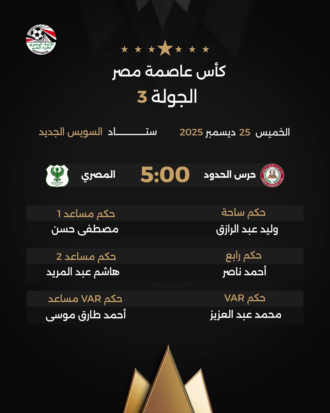 2. المصري ضد حرس الحدود (5:00 مساءً): يستضيف "ستاد السويس الجديد" هذا اللقاء تحت صافرة الحكم وليد عبد الرازق، ويعاونه مصطفى حسن وهاشم عبد المريد، فيما يتواجد محمد عبد العزيز في غرفة الـ VAR.