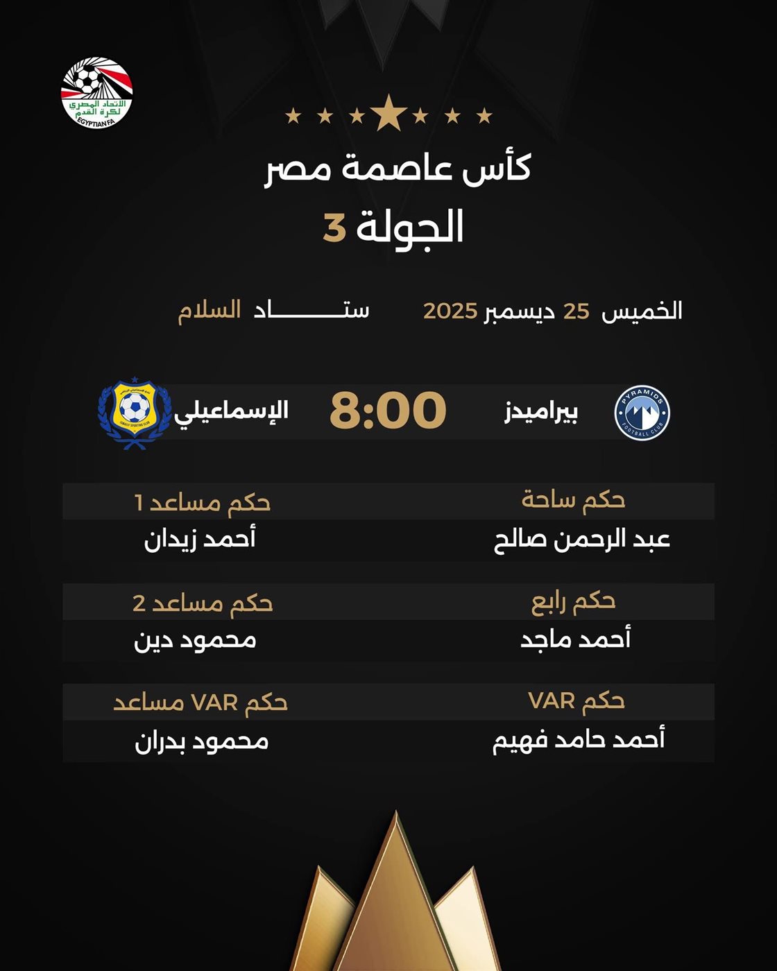1. الإسماعيلي ضد بيراميدز (8:00 مساءً): تقام المباراة على "ستاد السلام"، ويقودها تحكيميًا عبد الرحمن صالح كحكم ساحة، بمساعدة أحمد زيدان ومحمود دين، بينما يتولى أحمد حامد فهيم مسؤولية غرفة الـ VAR.