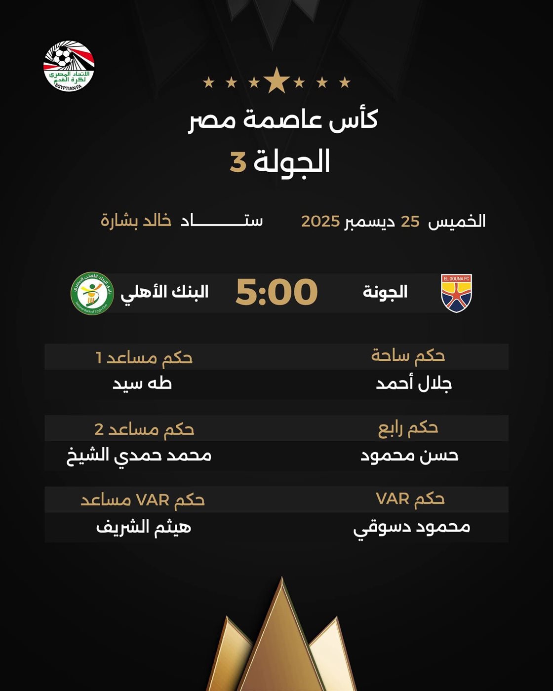 3. الجونة ضد البنك الأهلي (5:00 مساءً): وعلى "ستاد خالد بشارة"، يدير الحكم جلال أحمد مواجهة الجونة والبنك الأهلي، بمعاونة طه سيد ومحمد حمدي الشيخ، ويقود تقنية الفيديو الحكم محمود دسوقي.