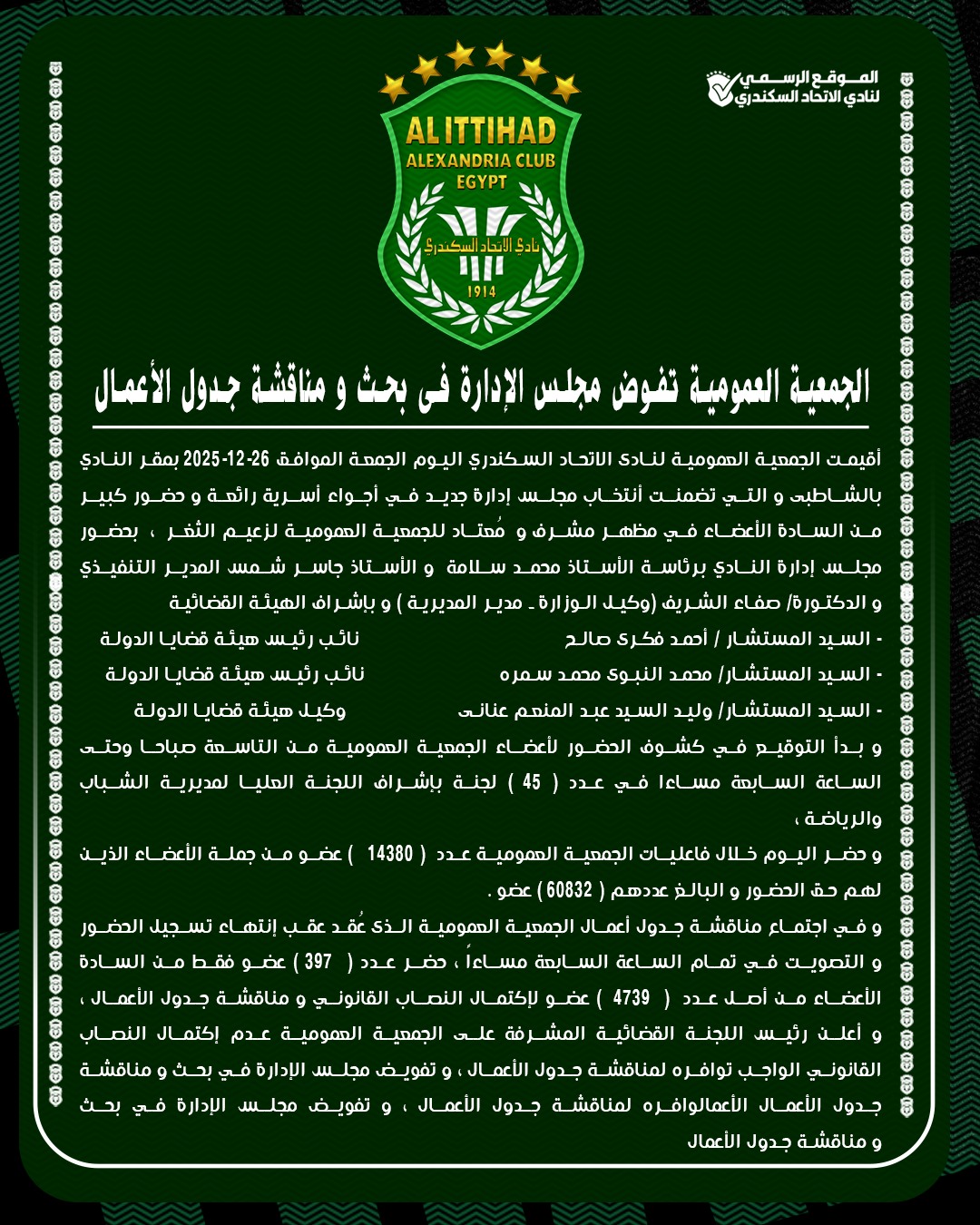 الجمعية العمومية لنادي الاتحاد السكندري تفوض مجلس الإدارة بمناقشة جدول الأعمال