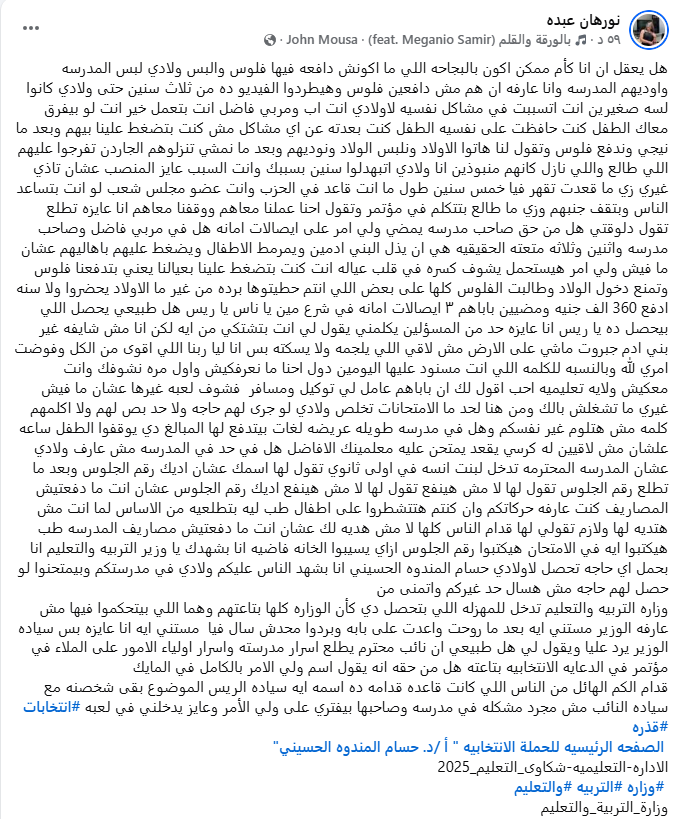 وطالبت نورهان عبده، وزارة التربية والتعليم بفتح تحقيق عاجل في الوقائع، ومراجعة سياسات المدارس الخاصة فيما يتعلق بتحصيل المصروفات، وحماية الطلاب من أي ضغوط نفسية أو ممارسات تمس كرامتهم داخل المؤسسات التعليمية.