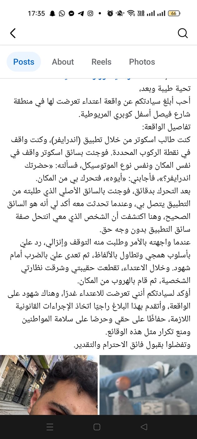 وشارك الشاب عبر حسابه منشورا زعم فيه تعرضه للضرب والاعتداء من شخص انتحل صفة سائق تطبيق نقل ذكي وجاء في المنشور: أحب أبلغ سيادتكم عن واقعة اعتداء تعرضت لها في منطقة شارع فيصل أسفل كوبري المريوطية.