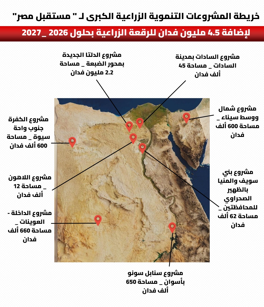 المعالم التي تحققت خلال العقد الأخير تعكس تحولًا نوعيًا في إدارة المشروعات الزراعية، من فلسفة تتعامل مع عشرات الآلاف من الأفدنة سنويًا، إلى نموذج متكامل يواكب المعايير الحديثة ويضمن استدامة الموارد، وخاصة المياه، عبر منظومات ري حديثة وإعادة استخدام مياه الصرف الزراعي وتطبيقات الزراعة الذكية، وأصبح ما حققته مصر نموذجًا بحتذى به إقليميًا ودوليًا، حيث تسعى دول عربية وأفريقية للاستفادة من خبرات مهندسيها في التوسع الأفقي والزراعة الصحراوية، لتصبح مصر اليوم مرجعًا عالميًا في تحويل الصحراء إلى مزارع منتجة ومستدامة.