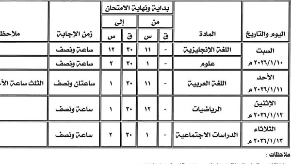 جداول امتحانات نصف العام 2026 للمرحلة الابتدائية