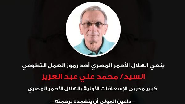 نعى الهلال الأحمر المصري، أحد رموز العمل التطوعي محمد علي عبد العزيز كبير مدربي الإسعافات الأولية بالهلال الأحمر، داعيًا المولى أن يتغمده برحمته.
