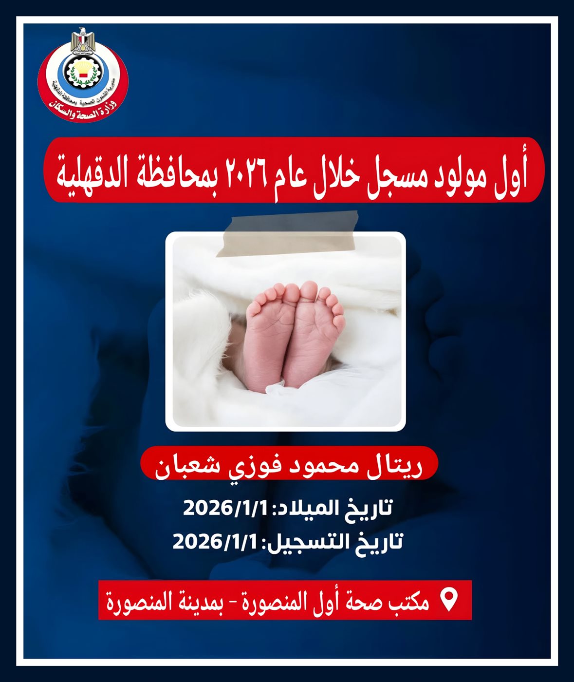 صحة الدقهلية تعلن تسجيل أول مولودة في العام الجديد 2026 بالمنصورة