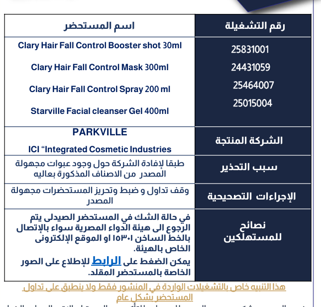 وأضافت هيئة الدواء أن هذه المستحضرات منتجة من قبل شركات PARKVILLE وICI "Integrated Cosmetic Industries"، وأن التحذير جاء بناءً على إفادة الشركات حول ظهور عبوات مقلدة وغير معروفة المصدر من هذه الأصناف.