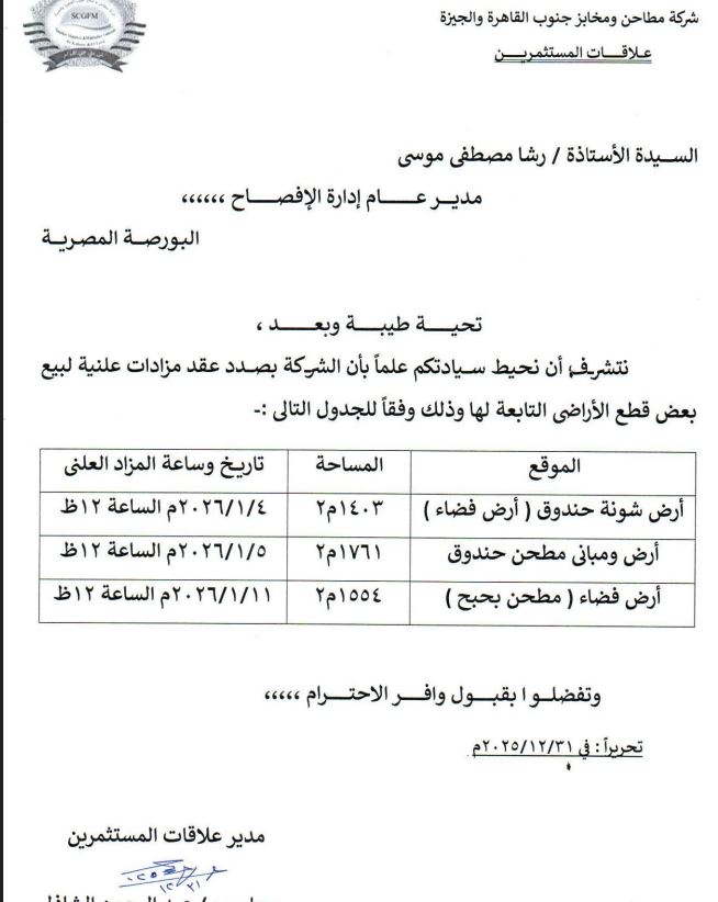 مطاحن جنوب القاهرة والجيزة تعلن بيع أراضٍ ومبانٍ في مزاد علني