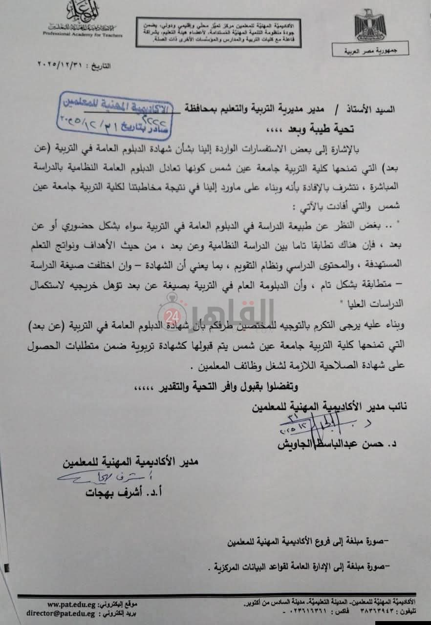 كشفت الأكاديمية المهنية للمعلمين أن شهادة الدبلوم العامة في التربية بنظام التعليم عن بعد، التي تمنحها كلية التربية بجامعة عين شمس، تتطابق مع شهادة الدبلوم العامة في التربية بنظام الدراسة المباشرة من حيث الأهداف التعليمية، ونواتج التعلم، والمحتوى الدراسي، ونظام التقويم.
