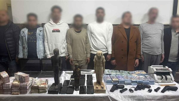 عقب تقنين الإجراءات أمكن ضبط 8 أشخاص حال تواجدهم بإحدى الفيلات المستأجرة بدائرة قسم شرطة ثان الشيخ زايد بالجيزة وبحوزتهم 3 تمثال متوسطي الحجم يشتبه في أثريتها و3 طبنجات صوت ومبلغ مالي عملات أجنبية ومحلية مقلدة و2 سلاح أبيض و12 هاتف محمول وجهاز لاب توب وجهاز آي باد.