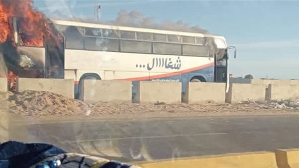 وتلقت الأجهزة الأمنية إخطارًا بنشوب حريق في أتوبيس على الطريق، وتم انتقال سيارات الحماية المدنية والإسعاف إلى موقع البلاغ، للتعامل مع الحريق والسيطرة عليه، إلا أن النيران التهمت محتويات الأتوبيس من الخلف.