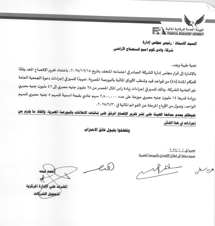 الرقابة المالية توافق على نشر إفصاح زيادة رأسمال وادي كوم أمبو لاستصلاح الأراضي
