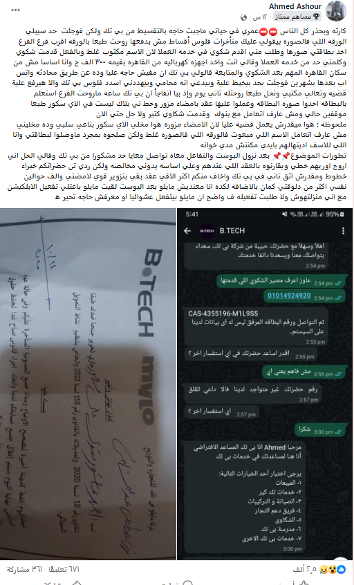 وأضاف في منشوره على فيس بوك: المهم بعد الشكوى والمتابعة قالولي بي تك إن مفيش حاجة عليا وده عن طريق محادثة واتس آب، بعدها بشهرين فوجئت بحد بيخبط علية وبيدعي إنه محامي وبيهددني أسدد فلوس بي تك وإلا هيرفع عليا قضية، وتعالى مكتبي ونحل طبعا.