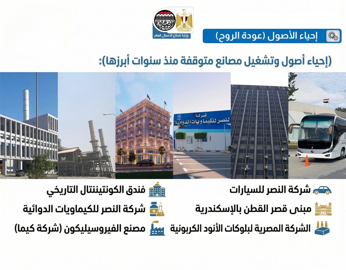 وفي إطار إحياء الأصول وعودة الروح للمصانع المتوقفة، تم إعادة تشغيل عدد من الكيانات المهمة بعد سنوات من التوقف، أبرزها شركة النصر للسيارات، وشركة النصر للكيماويات الدوائية، والشركة المصرية لبلوكات الأنود الكربونية، ومصنع الفيروسيليكون بشركة كيما، ومشروع إحياء فندق الكونتيننتال التاريخي، إلى جانب تعظيم الاستفادة من مبنى قصر القطن بالإسكندرية.
