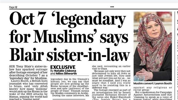 أثارت لورين بوت، الصحفية البريطانية المولودة في لندن وشقيقة زوجة رئيس الوزراء البريطاني الأسبق توني بلير، والتي اعتنقت الإسلام، غضبًا واسعًا بين أوساط اليمين البريطاني واليهود في المملكة المتحدة بعد أن وصفت أحداث 7 أكتوبر بأنها يوم أسطوري للأمة الإسلامية.