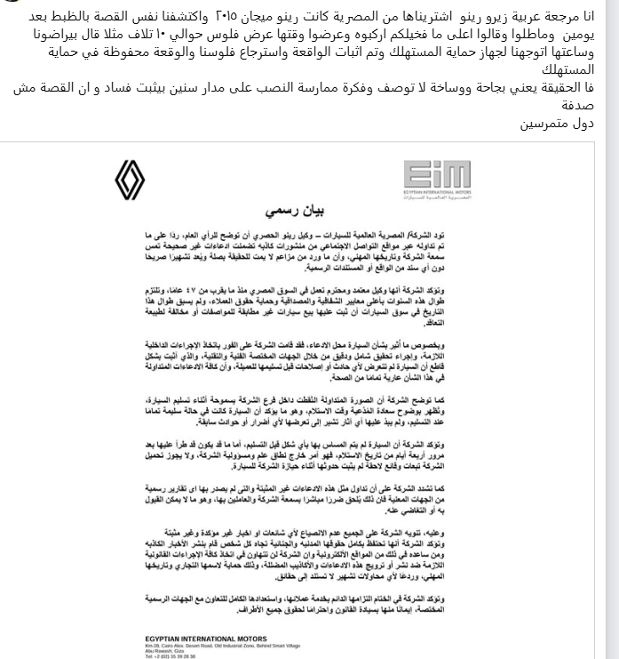 شاركت السيدة منشورا عبر منصة فيسبوك للتواصل الاجتماعي: اشتريت سيارة رينو عام 2015 واكتشفت كمان أنها مستعملة مفيش يومين ورجعتهالهم بعد ما اكتشفت القصة، وقتها الشركة عرضت عليا عرضوا وقتها فلوس حوالي 10 آلاف مثلا قال بيراضونا وساعتها اتوجهنا لجهاز حماية المستهلك وتم إثبات الواقعة واسترجاع فلوسنا والواقعة محفوظة في حماية المستهلك، فالحقيقة يعني ده نصب ومشكلة كبيرة وناس متعرفش ربنا حسبي الله ونعم الوكيل فيهم.