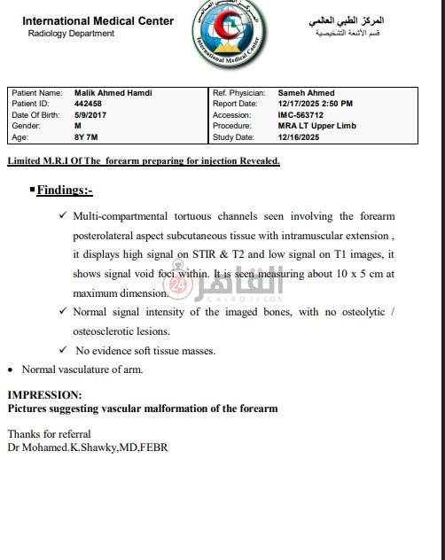 وأضافت والدة الطفل أن الخطة العلاجية تعتمد على جلسات شهرية للأشعة التداخلية، تبلغ تكلفة الجلسة الواحدة نحو 70 ألف جنيه، مشيرة إلى أن الخبير الأجنبي المتخصص في هذا النوع من الحالات من المقرر أن يصل إلى مصر مطلع شهر فبراير، على أن تكون أول جلسة علاج لمالك في هذا التوقيت.