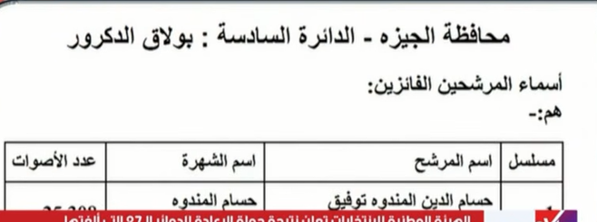 أعلن القاضي حازم بدوي رئيس الهيئة الوطنية للانتخابات، منذ قليل، نتائج جولة الإعادة بالدوائر الـ27 الملغاة ضمن المرحلة الأولى من انتخابات مجلس النواب، بحكم المحكمة الإدارية العليا.