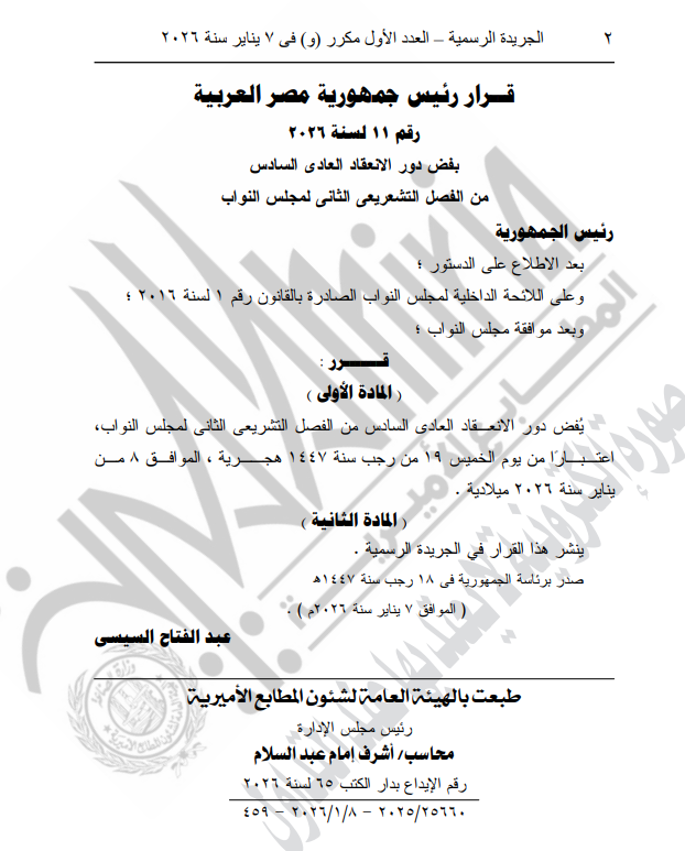 نشرت الجريدة الرسمية قرار الرئيس عبد الفتاح السيسي، رقم 11 لسنة 2036 بفض دور الانعقاد العادي السادس من الفصل التشريعي الثاني لمجلس النواب، اعتبارا من يوم الخميس 19 من رجب سنة1447 هجرية، الموافق 8 من يناير سنة 2026 ميلادية.
