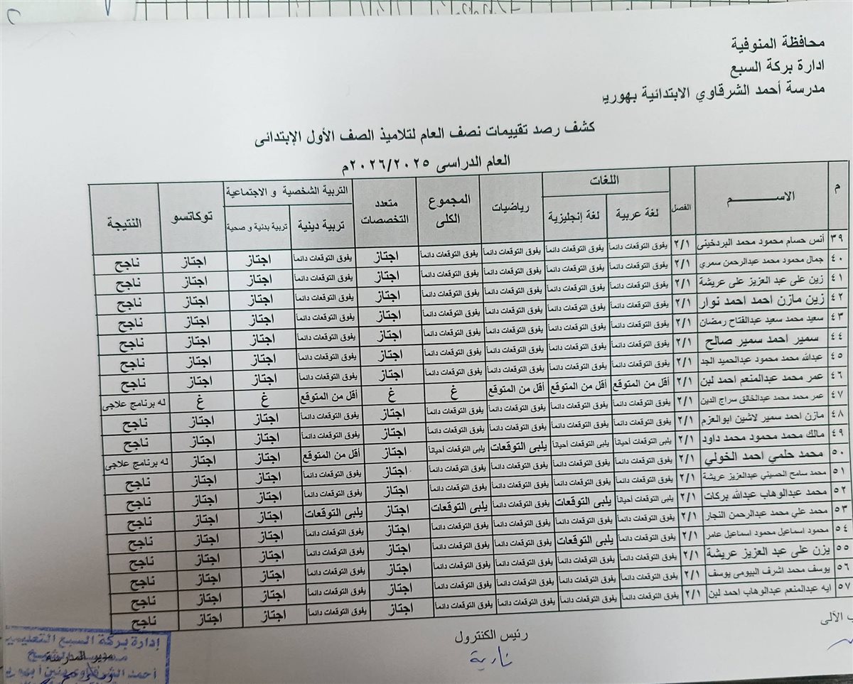 ظهرت الآن في بعض المدارس نتيجة تقييمات الصف الأول الابتدائي برقم الجلوس والاسم 2026.