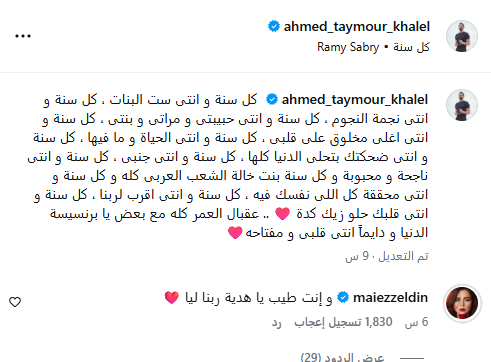 فكتب أحمد تيمور منشورًا، عبر حسابه الشخصي بموقع تبادل الصور والفيديوهات إنستجرام، جاء فيه: كل سنة وأنتِ ست البنات، كل سنة وأنتِ نجمة النجوم، كل سنة وأنتي حبيبتي ومراتي وبنتي، كل سنة وأنتِ أغلى مخلوق على قلبي، كل سنة وأنتي الحياة وما فيها، كل سنة وأنتي ضحكتك بتحلى الدنيا كلها.