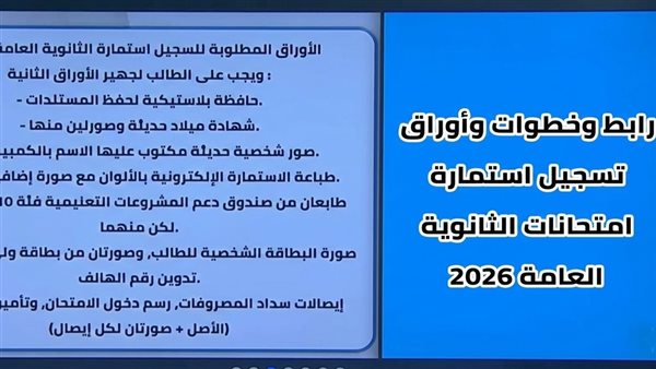 وقبل تسجيل الاستمارة إلكترونيا، يجب أن يجهز الطالب متطلبات استمارة الثانوية العامة 2026، أو استمارة التقدم لامتحانات الثانوية العامة، وإنشاء حسابي مدرسي، في حالة إذا لم يكن للطالب بريد إلكتروني، وفيما يلي المستندات الرسمية المطلوبة والتي يجب تجهيزها من قبل البدء في التسجيل: