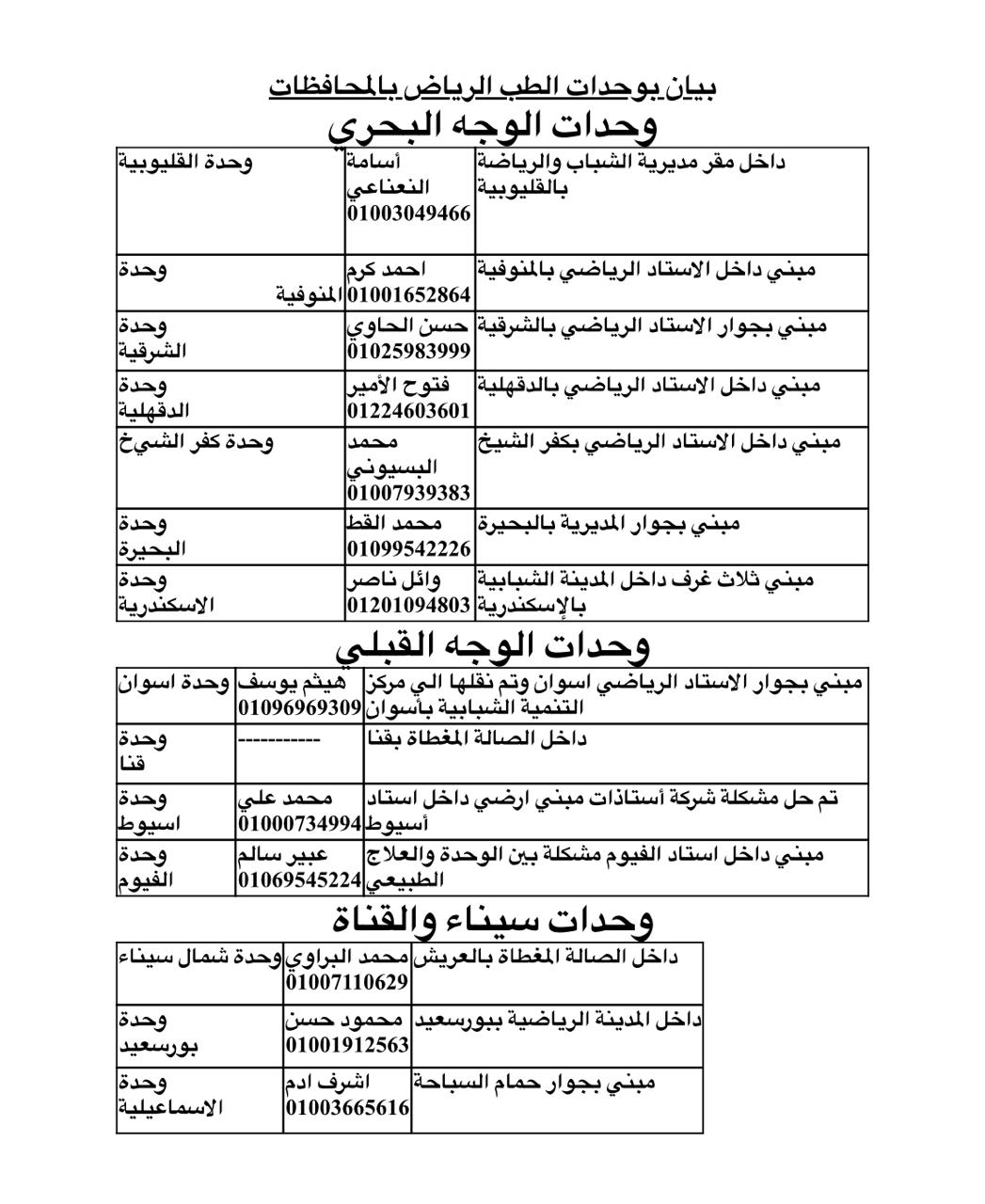 وأعلنت وزارة الرياضة عناوين وحدات الطب الرياضي بالمحافظات والتي جاءت كالتالي: