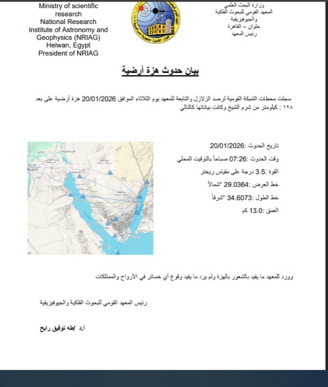 أعلن المعهد القومي للبحوث الفلكية والجيوفيزيقية، أن محطات الشبكة القومية لرصد الزلازل سجلت حدوث هزة أرضية، صباح اليوم الثلاثاء الموافق 20 يناير 2026، على بُعد نحو 128 كيلومترًا من شرم الشيخ.