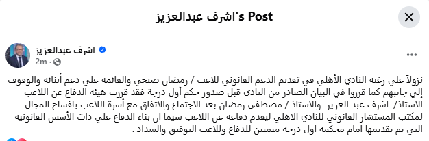 أعلن المحامي أشرف عبد العزيز، عبر حسابه الشخصي على فيسبوك، عن قرار هيئة الدفاع عن اللاعب رمضان صبحي بإفساح المجال للمستشار القانوني للنادي الأهلي؛ لتولي تقديم الدعم والدفاع القانوني عن اللاعب خلال المرحلة المقبلة.