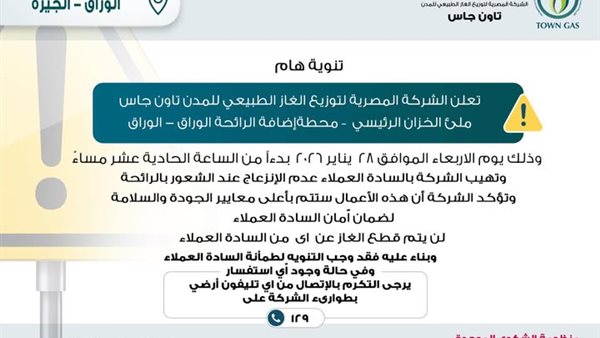 تاون جاس تعلن ملء خزان الرائحة بمحطة الوراق يوم الأربعاء المقبل 28 يناير 2026